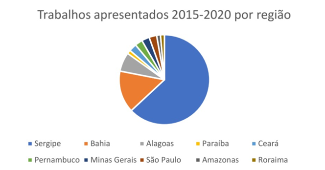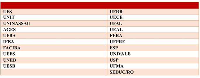 Foram 22 instituições participantes nesse eixo, sendo a Universidade Federal de Sergipe a instituição mais prevalente nas submissões com 35 trabalhos. No quadro 02 indicamos as instituições de origem dos trabalhos apresentados.