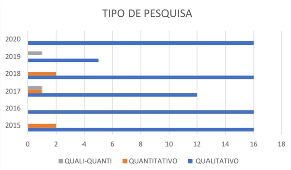 Em relação às metodologias utilizadas pelos trabalhos levantados nesse período, observa-se que ao longo de 2015 a 2020 os trabalhos qualitativos são mais evidentes nos trabalhos selecionados, contabilizando um total de 80 trabalhos qualitativos, 05 trabalhos quantitativos e 02 na modalidade qualitativo-quantitativo. O Gráfico 03 aborda o resultado dos tipos de pesquisa das publicações, por ano pesquisado.