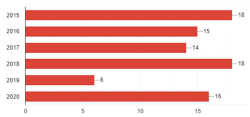 [4] Foi identificado 03 trabalhos sem palavras-chave em 2020 e 2019, respectivamente, e em 2016 foi identificado 01trabalho sem palavras-chave.