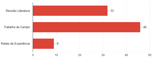 Quanto as modalidades das publicações, foram definidas previamente as seguintes categorias: revisão de literatura, trabalho de campo (pesquisa empírica) e relato de experiência. A revisão de literatura foi uma categoria aglutinadora de trabalhos que desenvolviam revisão sistemática de literaturas e ou revisão conceitual, com discussão apenas teórica de um determinado assunto. A categoria trabalho de campo constitui uma categoria onde foram elencados os trabalhos empíricos, com apresentação dos resultados da pesquisa de campo. Geralmente os resultados eram fundamentados em uma metodologia, discussão dos resultados e conclusão. A categoria relato de experiência constitui-se em trabalhos acadêmicos e profissionais que apresentavam reflexões pessoais sobre a atuação em serviço, de práticas ou vivências.