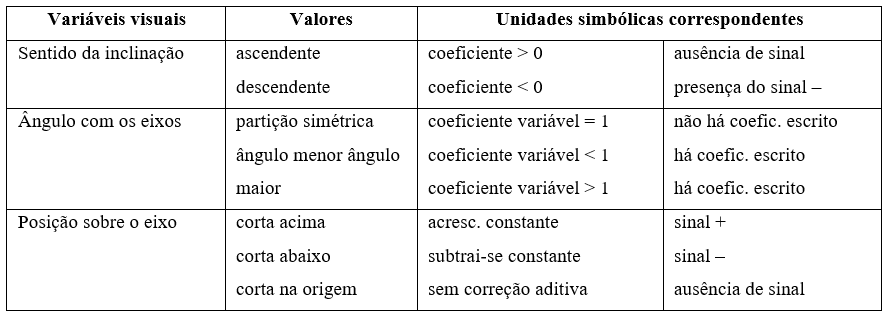 Em uma expressão algébrica, cada símbolo corresponde geralmente a uma unidade significativa. Existe, no entanto, unidades significativas em que os símbolos são omitidos: o coeficiente 1, o caráter positivo dos coeficientes maiores do que zero. Deste modo, não se escreve y = +1x, em contrapartida, escreve-se y = –2x. O lembrete desta trivialidade é importante uma vez que se trata de fazer corresponder variáveis visuais pertinentes do gráfico com unidades significativas da expressão algébrica. (DUVAL, 2012, p. 100).