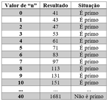 No quadro 1, podemos observar que até n = 39 os valores obtidos a partir da expressão supracitada resultarão num número primo. Do ponto de vista empirista é possível que essa expressão possa representar somente números primos maiores ou iguais a 41 dado que, para 40 valores inteiros não-negativos de n (variando 0 a 39), resultam num valor primo. Esta situação retrata como a experimentação na Matemática pode chegar a conclusões equivocadas. Para um racionalista, a tese sobre esta expressão só poderia ser aceita a partir de uma prova direta, ou refutada com uma contraprova (contraexemplo). O contraexemplo já está na própria tabela. O leitor então poderia se questionar que até o racionalista poderia cair na tentação de aceitar esta tese, pois não teria o trabalho de verificar até n = 40. Mas há outros caminhos possíveis que não necessariamente necessitam atribuir valores de “n” ao acaso. Daí a importância das representações em Matemática. Pode-se pensar numa contraprova a partir da seguinte ideia: é possível que para algum n inteiro não-negativo podemos encontrar um valor resultante que não seja primo para a expressão n2+n+41? Considerando n par, pode-se escrever n = 2k. Substituindo na expressão obtêm-se 4k2+2k+41=2.2k2+k+41. Note que as expressões 2.2k2+k é um número par, pois há o fator 2 nesta multiplicação. Somando um número par a um valor ímpar, neste caso 41, tem-se como resultado um número ímpar para a expressão. Considerando n ímpar agora, é possível denotá-lo por n = 2k + 1. Chegar-se-á à expressão 22k2+3k+43. Observe esta expressão é um número ímpar pelo mesmo motivo já exposto. Assim, a conclusão que é que para qualquer valor de n, tal que n∈Z+, tem-se um valor ímpar. Mas será que todo número ímpar obtido dessa expressão representa um primo? Considere agora a seguinte situação: n2+n+41=k' sendo k'[Imagem local removida] um número ímpar. Desta forma, tem-se:n2+n+41-k'=0. Usando a técnica do completamento de quadrados chega-se a seguinte expressão: n+12=k'-1634. Admitindo que essa equação possua raízes reais, deve-se admitir que k'-1634≥0, ou seja, k'≥40,75. É importante lembrar que por hipótese, o k' é um número ímpar. É sugestivo então que se tome n=41 na expressão n2+n+41. Fica evidente agora que nem todo ímpar resultante da expressão é primo. Note que para n=41 o valor obtido na expressão é múltiplo de 41. Neste caso, o valor atribuído para n não foi obtido de forma aleatória, mas sim porque chega-se a uma conclusão para k'[Imagem local removida] que induz a tentativa de n para um valor inteiro maior que 40,75, neste caso, 41. A simbologia e representações implementadas no desenvolvimento da contraprova chegaram a uma conclusão que refutou a ideia inicial acerca da expressão sempre fornecer primos maiores ou iguais a 41.