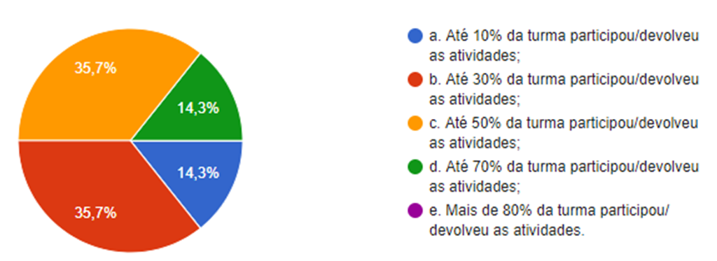 Infelizmente, apesar dos esforços para que as crianças não perdessem o vínculo com a escola, a verdade é que, a partir do que foi apontado pela maioria dos profissionais, pelo menos metade da turma não frequentou ou devolveu as atividades, conforme mostra o gráfico abaixo: