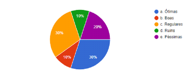 Ainda sobre esta questão, identificou-se que 40% dos respondentes demonstrou satisfação quanto à organização/frequência do envio/realização das atividades remotas ofertadas para as crianças, classificando-as como ótimas ou boas, enquanto o restante apresentou algum tipo de insatisfação quanto a isso, como se vê: