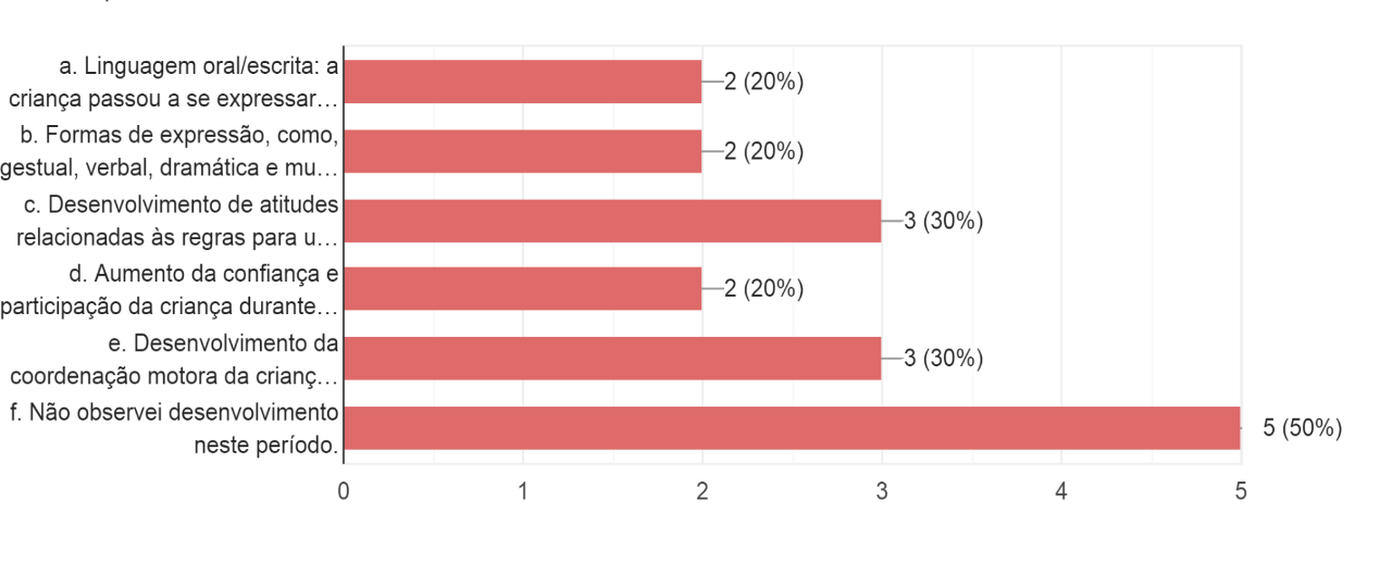 Diante do exposto, percebe-se que 50% dos pais/responsáveis declararam não ter observado nenhum desenvolvimento nas crianças durante o período das atividades remotas, ao passo que a outra metade conseguiu perceber avanço em pelo menos um aspecto. É importante ressaltar que era possível marcar mais de um item, envolvendo linguagem oral/escrita (a criança passou a se expressar mais, aumentou o seu vocabulário, o seu repertório de palavras, passou a ter mais interesse pela leitura de rótulos, propagandas e etc. A criança se mostrou motivada a escrever o seu nome e demais palavras de seu interesse); formas de expressão (a criança pa