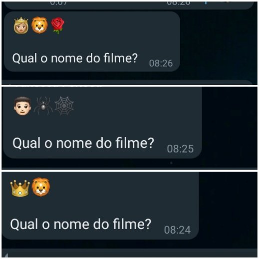 Ao trabalharmos na disciplina de História, por exemplo, o conteúdo da História da Escrita, tínhamos como objetivo levar os alunos ao conhecimento da importância da escrita para a humanidade. Como era de costume adotado pela professora da turma, começamos a aula saudando a turma no grupo online do WhatsApp com uma mensagem enviada. Após esse momento, foi realizada a chamada, solicitando que os alunos confirmassem a presença respondendo no grupo online. Após esse momento, demos o sinal no grupo indicando que começaríamos nossa aula de História. Como primeira atividade, realizamos uma dinâmica enviando várias imagens de emojis para que os alunos pudessem adivinhar o nome de um filme associado àquela imagem, conforme apresentado na Figura 1: