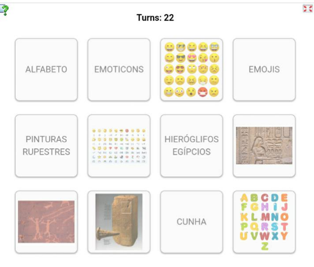 A intenção dessa dinâmica foi criar um ambiente de descontração para introduzirmos o conteúdo da aula. Após a dinâmica, explicamos que o fato deles terem conseguido associar os símbolos dos emojis aos nomes dos filmes, tinha uma explicação do ponto de vista do conteúdo que iriamos estudar naquele momento sobre a história da escrita. Explicamos que a escrita evolui ao longo dos anos e que os emojis também eram exemplos de evolução da escrita, uma vez que esse tipo de registro, chamado de escrita ideográfica, tem como objetivo usar de imagens ou símbolos para representar uma ideia, ainda que esta ideia não seja representada por letras. Após esse momento de diálogo no grupo online por meio de áudios, aguardamos alguns minutos para sanar as dúvidas dos alunos. Como atividade de aplicação do conhecimento, enviamos um jogo da memória educativa sobre o conteúdo e pedimos que após eles concluírem, tirassem print da tela e postassem no grupo online, conforme é possível observar na Figura 2 a seguir: