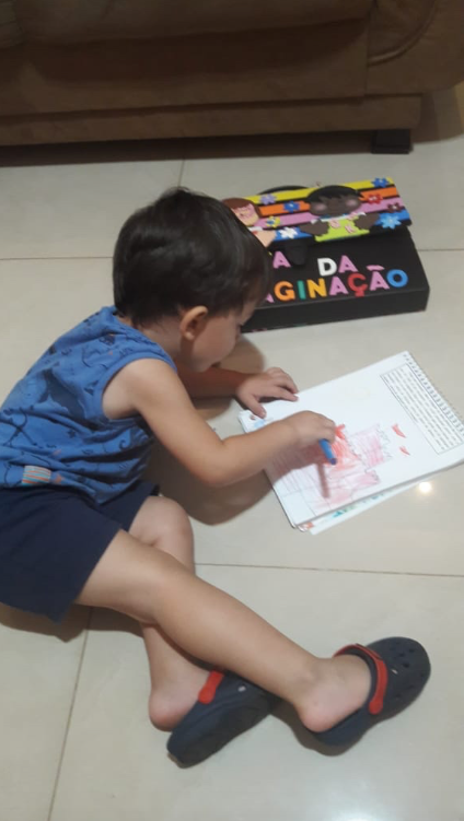 O momento de Leitura com a criança 4 foi maravilhoso, ela ficou atenta e interessada durante toda a história. Durante a pintura da caixa ela lembrou do “homem” da história. Foi um momento muito gostoso em família, cada um contribuiu com uma parte na confecção do brinquedo, ela se sujou toda de tinta e foi a maior diversão (grifos meu).