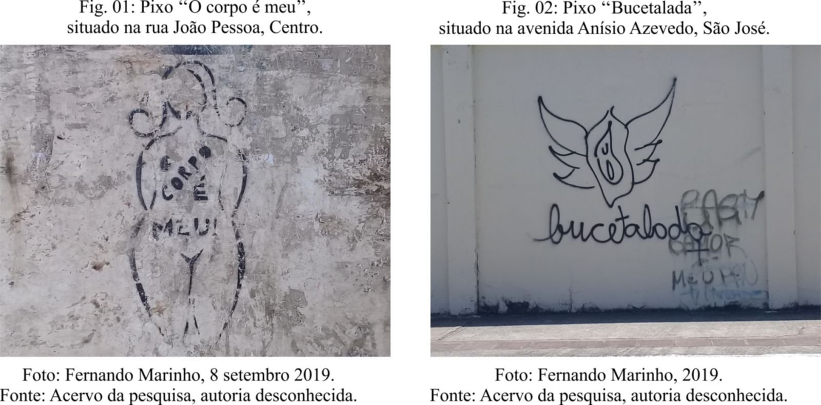 Entre 2019 e 2020 realizamos um levantamento fotográfico inicial de pixações de cunho feminista em quatro bairros da cidade de Aracaju: Centro, São José, Salgado Filho e Grageru. Foram identificadas nove pixações (Figuras 1 a 9) que apresentam uma temática feminista: "O corpo é meu", "Bucetalada", "Buceta", "Buceta é mulher somando na rua", "Xibiuti", "Juno", "Fiq atenta", "Fé nas mina" e "#Ele não!". Entendemos que tais intervenções na paisagem da cidade apresentam debates que fazem alusão as questões defendidas pelos movimentos feministas.