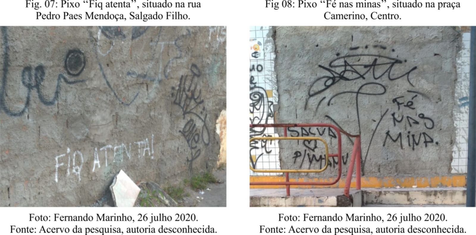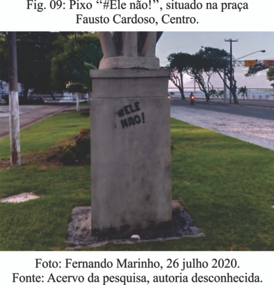 Na pixação "Fiq atenta!" (Fig. 07), de forma mais efetiva as questões de violência com o feminino são evidenciadas. O pixo "Fé nas mina" (Fig. 09), pode caracterizar um sentimento de sororidade e fortalecimento da condição feminina. Em "#Ele não!" (Fig. 09), marca um momento político muito importante na história recente do Brasil, um grande movimento de mulheres contra a campanha eleitoral do presidente Bolsonaro em 2018.