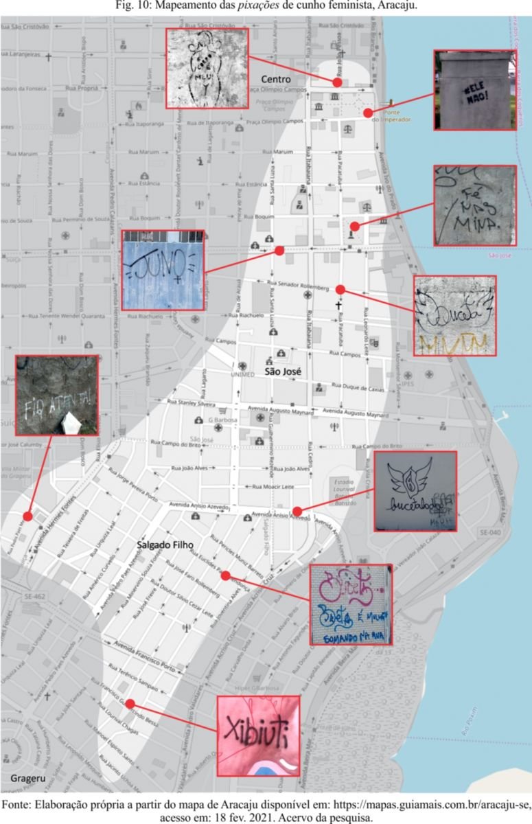 Após realizarmos o levantamento fotográfico, a escolha das pixações de cunho feminista em Aracaju e a elaboração do mapeamento das pixações (fig. 10) nos chamou atenção o debate sobre a Geografia Cultural indicado pelo professor Christian Boudou em disciplina do mestrado em Culturas Populares/UFS, notadamente relativo aos conceitos de paisagem dominante e paisagens alternativas discutidos no tópico anterior. A partir desse fundamento, foi possível chegar ao questionamento sobre a possibilidade de uma paisagem alternativa constituída pelas pixações de cunho feminista.