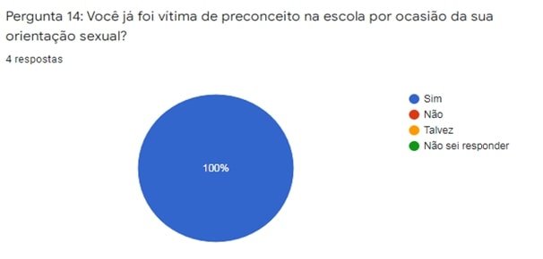 Quando questionadas sobre terem sido vítima de preconceito na escola por ocasião da orientação sexual, um total de 100% das estudantes pesquisadas, 04 (quatro), responderam que já foram vítimas de preconceito no ambiente escolar por questões relacionadas à sexualidade. Sabe-se que as temáticas relativas à diversidade de gênero e sexual são invisíveis no currículo e também silenciadas nos debates sobre direitos humanos e no âmbito do conselho escolar; esse contexto de “vigilância” é um dispositivo violento de exclusão que dificulta o processo de aceitação e de identificação da sexualidade, conforme relato: “Eu demorei bastante para perceber que gostava de meninas e antes me identificava como Bi, mas aí descobri o conceito de heterossexualidade compulsória e percebi que só estava me enganando, então comecei a me aceitar como sou, lésbica” (Carolina). A transição da bissexualidade para a lesbianidade de Carolina indica a aceitação da própria sexualidade, ter sido um momento em que ela tentava se adequar ao padrão da heterossexualidade compulsória, a qual impõe uma matriz de inteligibilidade, ou seja, uma coerência e uma continuidade entre sexo/gênero/desejo e práticas sexuais. Contudo, nas palavras de Carolina, ela parou de se enganar e ocorreu a desidentificação com a norma, após perceber a existência de uma demarcação discursiva. Butler (2008), traz uma importante reflexão sobre o sexo como um ideal regulatório cuja materialização é imposta através de uma reiteração forçada das normas. A autora chama a atenção para o fato de que se essa reiteração é necessária, é sinal da materialização não ser nunca completa, pois os corpos não se conformam nunca, completamente, às normas pelas quais sua materialização é imposta. O relato de Carolina corrobora o pensamento de Buler, pois o que constitui a fixidez do corpo, é algo material, mas essa materialidade é repensada, ou seja, embora os discursos tendam a cultivar identificações a serviço de um objetivo político, pode ocorrer a desidentificação, que é fundamental para a rearticulação democrática. Destarte, Lima (2016), em sua pesquisa também chama a atenção para o apagamento e a invisibilização das lesbianidades durante a educação básica. A autora ao investigar as trajetórias escolares de mulheres lésbicas e bissexuais, destaca a falta de informações sobre a existência lésbica e de reconhecimento dessas mulheres. Para a pesquisadora, em uma lógica binária, hegemônica no espaço escolar, ocorrem prejuízos à identificação de si própria como lésbica ou bissexual nos processos de subjetivação. Desse modo, com a fiscalização do afeto e a não valorização das diferenças, essas mulheres não se sentem confortáveis ou seguras para viver suas sexualidades plenamente nos ambientes escolares. O gráfico abaixo nos auxilia a visualizar o percentual das estudantes que já foram vítimas de preconceito por conta da orientação sexual: