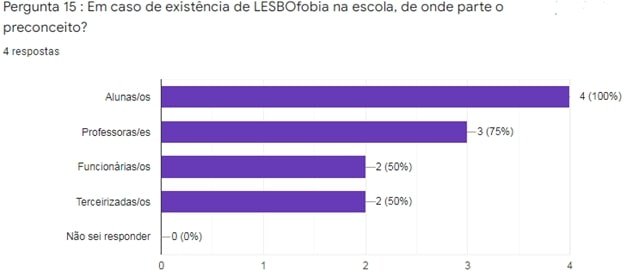 Quando se perguntou sobre de onde parte o preconceito na universidade ficou evidente, quando parte dos professores, há uma grande barreira para se realizar a denúncia, que pode estar relacionada ao receio de perseguição, assédio e até mesmo a retenção no curso. Isso indica não apenas a fragilidade de uma política efetiva para a comunidade LGBTQI+ na universidade, mas principalmente a presença de discursos homofóbicos em sala de aula, de modo que nos leva a pensar no deslocamento para com a realidade social de parte do corpo docente e do impacto que a violência de gênero tem na vida de jovens estudantes.