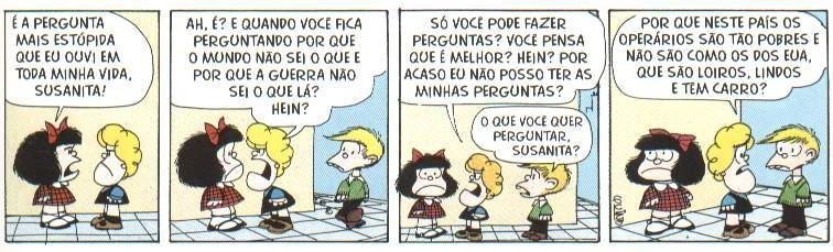 Na primeira sequência discursiva temos uma cena em que as personagens Mafalda e Susanita discutem por causa de questionamentos. Susanita se mostra insatisfeita e irritada por Mafalda achar sua pergunta estúpida e, ao mesmo tempo, aponta que Mafalda é questionadora e ela(Susanita) não se incomoda com isso. Quando Filipe quer saber sua pergunta, Susanita diz: “Porque nesse país os operários são tão pobres e não são como os do EUA, loiros, lindos e tem carro? Os efeitos de sentido do discurso da personagem é de preconceito e de exclusão. A criança observa que no seu país – no caso Argentina – os operários são pobres e, na sua fala, já é possível perceber a indiferença perante essa condição econômica que é reforçada no final ao mencionar ‘tem carro”. Ou seja, os operários argentinos não têm carro e também não são loiros e nem lindos. Além disso, são possíveis de ser identificados o preconceito racial – não são loiros – e o descontentamento com a classe operária do seu país que não é igual à classe operária dos EUA.