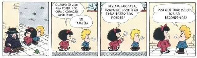 Ao fornecer as evidências do cotidiano, a ideologia , em seu funcionamento, determina os lugares sociais e a naturalização de discursos que vemos circular na sociedade. Essa naturalização de discursos como vistos na tirinha, preconceituosos e excludentes, ocorre sem a percepção dos sujeitos, pois em sua estrutura-funcionamento, como apontado por Pêcheux, a ideologia – assim como o inconsciente – dissimula sua própria existência. Em uma sociedade cujo sistema é o capitalismo, temos como ideologia dominante a capitalista, que é excludente, que dissemina o individualismo, as desigualdades e exalta os bens e propriedades. Desse modo, podemos desvelar outros sentidos como “esconder” é mais fácil do que “solucionar”. Retirar mendigos, pessoas vulneráveis das ruas para não incomodar o olhar de que transita nas calçadas é mais cômodo do que transformar a realidade desses indivíduos. Nos últimos quadrinhos das duas tirinhas anteriores podemos observar a reação de indignação, surpresa e até insatisfação da Mafalda. O silêncio, o não-dizer da personagem também é fonte de significação, já que as suas expressões faciais expõem a sua não concordância com o discurso excludente de Susanita. E são nessas expressões que a personagem-criança demonstra sua resistência aos discursos e às ações que são dominantes na sociedade.