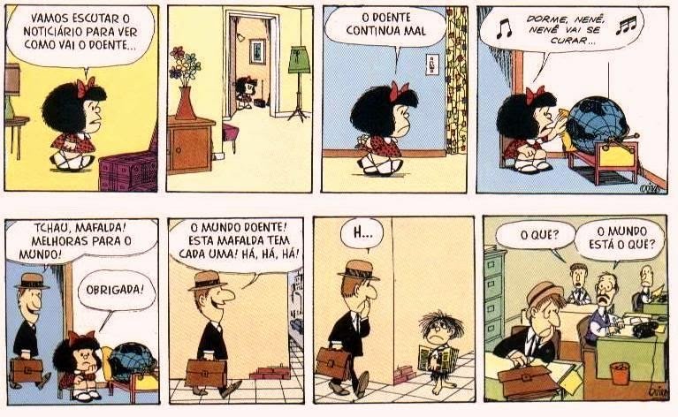 No sexto quadro o pai da Mafalda menciona “ O mundo doente! Esta Mafalda tem cada uma, ha, ha”. Aqui há um movimento de sentidos em relação ao doente, que é visto, inicialmente, como um sujeito que apresenta males físicos, doenças que debilitam o corpo ou a mente. Essa associação causa risos no final, pois, para o personagem-pai, a brincadeira de criança que cuida do globo como um boneco, um ser que precisa de cuidados, retrata apenas uma história infantil. Mas no último quadro a atitude do pai de Mafalda e suas expressões faciais demonstram uma mudança no sentido da palavra doente. Ao ser questionado por seus colegas “ o mundo está o que?” demonstra que o personagem-pai sofreu alguma mudança entre sair de casa e chegar ao trabalho. No penúltimo quadrinho podemos observar que o pai de Mafalda se depara com uma criança – em situação de vulnerabilidade – na rua, durante o seu trajeto para o trabalho. Possivelmente não foi a primeira vez que esse personagem passou ou viu alguém em uma situação de rua, em uma situação de miséria. Mas no exato momento em que ele passa pela rua, após ter visto e escutado Mafalda falar sobre o mundo doente e querer cuidar, acalentar o seu globo na tentativa de sará-lo, o olhar do pai para aquela situação mudou. A invisibilidade das pessoas e das situações que ocorriam no seu cotidiano deixou de existir nesse momento.