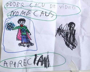 Como a proposta se aproximava de jogos e animações próximas da realidade dos estudantes, todos ficaram ávidos e curiosos em compreender melhor esta construção. Assim, pediu-se que separassem seus cadernos de desenho, buscassem uma folha em branco e distribuíssem entre si lápis, borracha, lápis de cor e canetinha. De antemão, foi possível observar as interações entre algumas figuras do aprender, como: a dificuldade em manejar um caderno, utilizar um lápis e as brigas em torno das distribuições dos materiais. Contudo, o desejo em saber o que viria por vir, mobilizou as crianças a se organizarem.