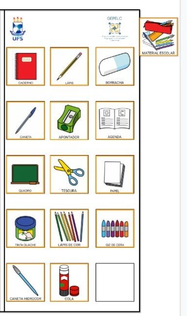 Para a categoria de Material Escolar (Figura 3) a ordem foi efetuada a partir dos elementos de maior necessidade diária, como: Caderno, Lápis, Borracha, Caneta, Apontador, Agenda, Quadro, Tesoura, Papel, Tinta, Lápis de cor, Giz de Cera, Caneta Hidrocor e Cola. Elementos que para o aluno sejam utilizados com regularidade, possibilitando a comunicação.