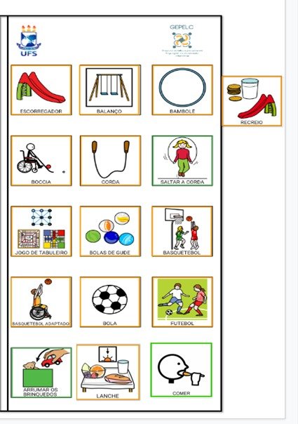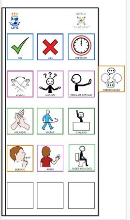 Assim, esse processo se deu de forma sistemática, a partir das seguintes etapas: avaliação das necessidades comunicativas e interacionais; separação de categorias temáticas para elaboração do material, de acordo com os contextos sociais e dos ambientes físicos da escola; seleção dos pictogramas com base nas necessidades e categorias definidas; organização da prancha; avaliação do material de CAA produzido.