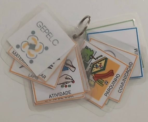 Como resultado desse processo de construção, entendemos também a necessidade de ir além da prancha, produzimos um material para potencializar o uso da CAA nesse espaço escolar, um Chaveiro de CAA (Figura 6). A construção desse material foi conduzida para poder otimizar a comunicação em momentos mais livres e que estabeleça a partir de elementos simples. A escolha dos pictogramas foi guiada a partir da prancha elaborada e pensando em elementos essenciais de cada categoria que possibilitasse estabelecer a comunicação de forma rápida e eficiente. Os pictogramas escolhidos foram: Material Escolar, Caderno, Lápis, Borracha, Atividade, Caneta, Lápis de cor, Papel, Recreio, Lanche, Parquinho, Pátio, Comunicação, Querer, Sim, Não, Comer, Água, Ir, Fazer xixi/cocô.