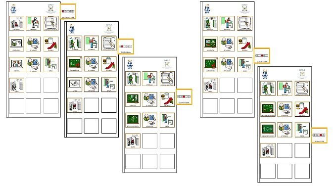 Ao finalizar cada categoria, o passo seguinte desse processo foi organizar a ordem das páginas de acordo com cada categoria. Especificamente essa prancha foi ordenada levando em consideração as atividades destacadas na rotina determinada pela escola e finalizando com a categoria da Comunicação, resultando na seguinte sequência: Rotina Diárias (Segunda-feira, Terça-feira, Quarta-feira, Quinta-feira e Sexta-feira), Material Escola, Recreio e Comunicação.